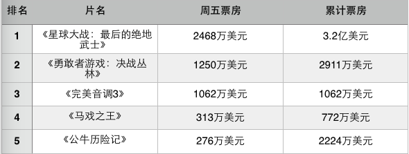 《星球大戰:最后的絕地武士》周五在4323家影院上映,賣出2468萬美元票房,累計票房已經突破3億美元關口,全球累計票房超過6億美元,預計將在這個圣誕檔周末收獲1.1億美元票房。