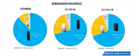 我們在之前文章中,公布了兩組組數據。一個是美國亞馬遜Echo和Google home的的市場份額。第二個是細分品類的份額。之前我們提到了,Echo show在2017年數據很耀眼,是亞馬遜Echo陣營的第三勢力。